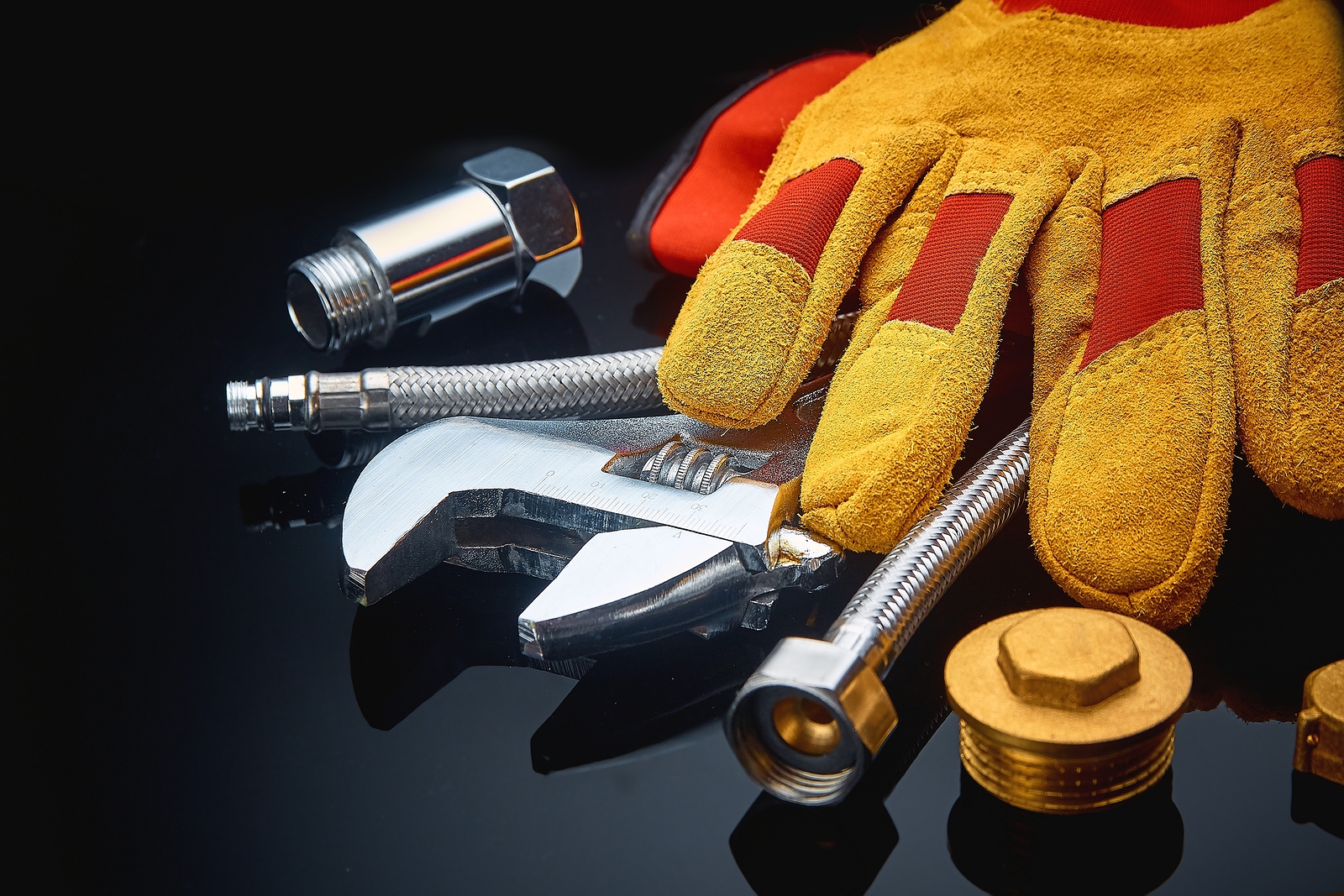 Plumbing Accessories On Textured Dark Background.